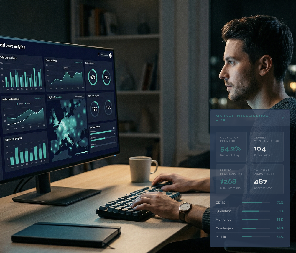 Más de 80 canchas instaladas en México nos dan acceso directo a la realidad operativa de los clubes. Nuestro sistema propietario tiene datos reales de ocupación y precios en las 15 principales ciudades del país, hora por hora, todos los días.